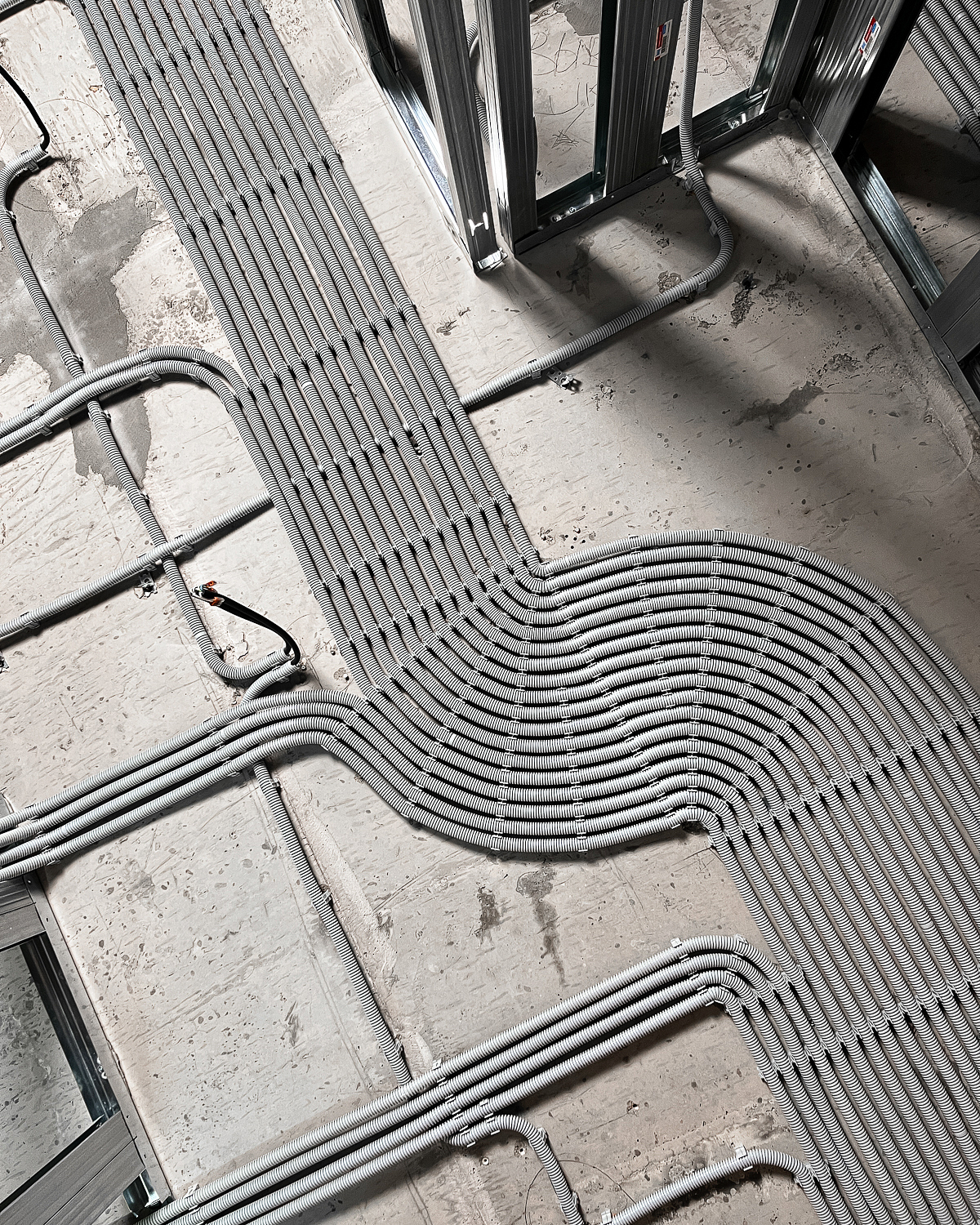 Насыщеная электрика. Два щита по 36 модулей для силовой и слаботочной части. Для трассировки по потолку понадобилось 500 метров силового и 100 метров слаботочного кабеля.